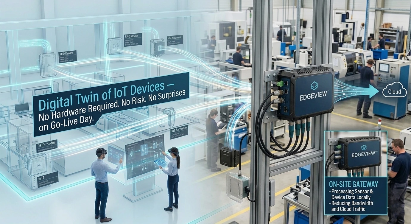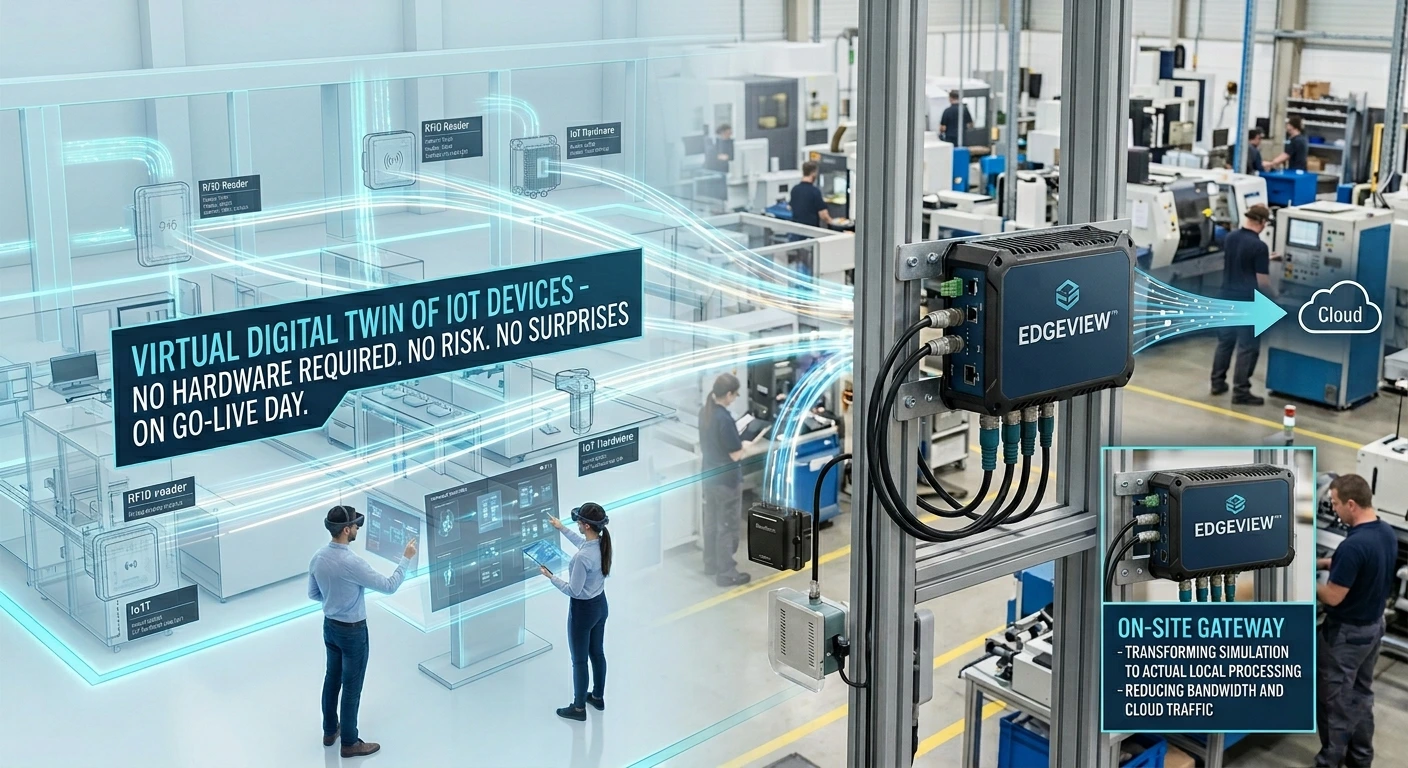 Deploying RFID readers, sensors, and IoT hardware across a facility is expensive and complex. EdgeView™ lets you simulate your entire operation first — running real workflows on a virtual digital twin of Iot devices on your floor — so you know exactly what you're getting before you commit.