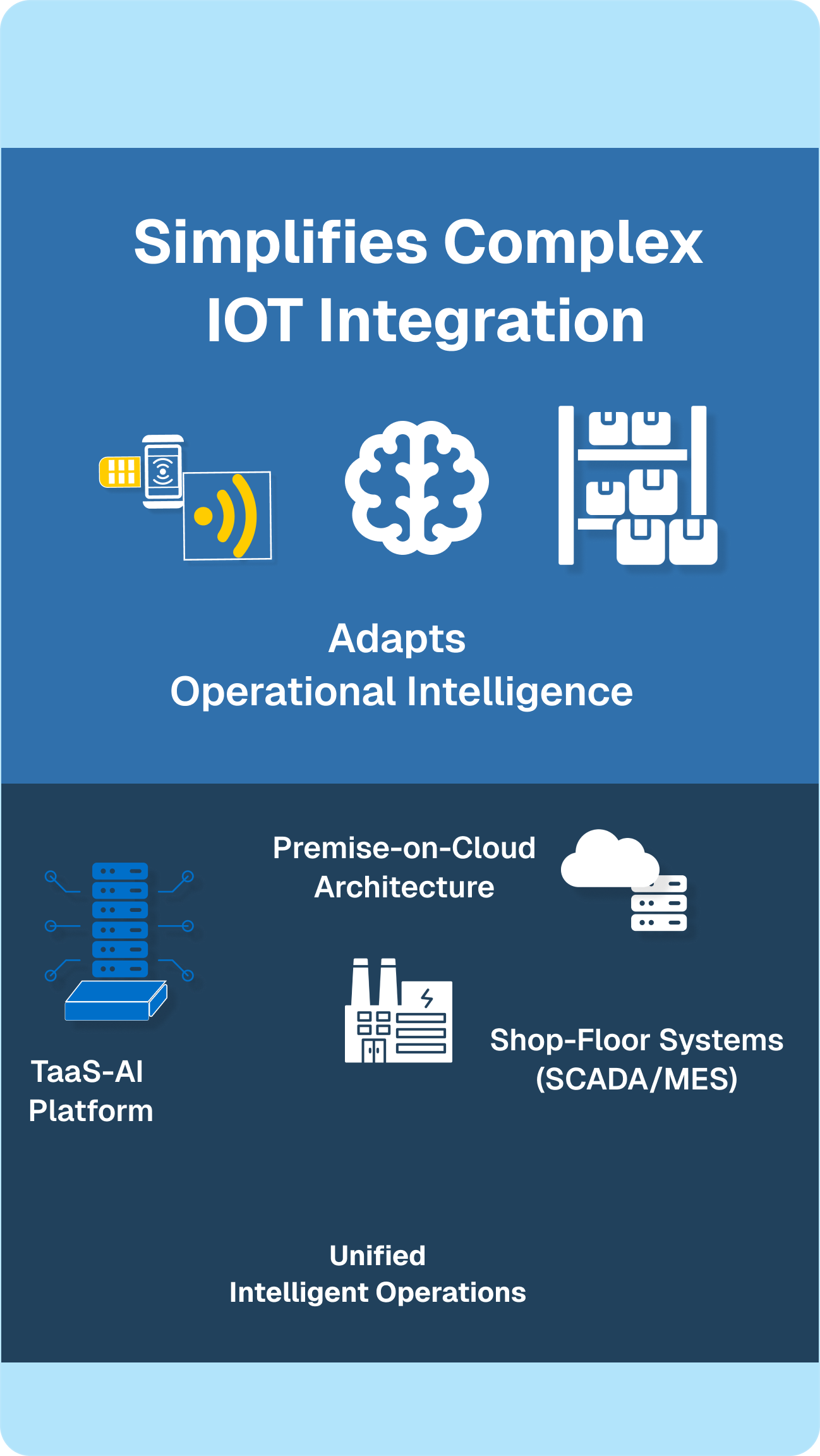 The TaaS-AI™ platform simplifies complex IoT integration, using a powerful and highly secure Premise-on-CloudTM SaaS framework. Our TaaS-AITM solutions quickly deploy operational intelligence integrating with your existing operations by mitigating risks through encrypted connectivity with on-premise enterprise and shop-floor systems.